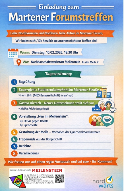 Das Martener Forum lädt am Dienstag, 10. Februar um 18.30 Uhr ganz herzlich interessierte Bürger und Bürgerinnen in die Nachbarschaftswerkstatt Meilenstein, In der Meile 2, in Marten ein.