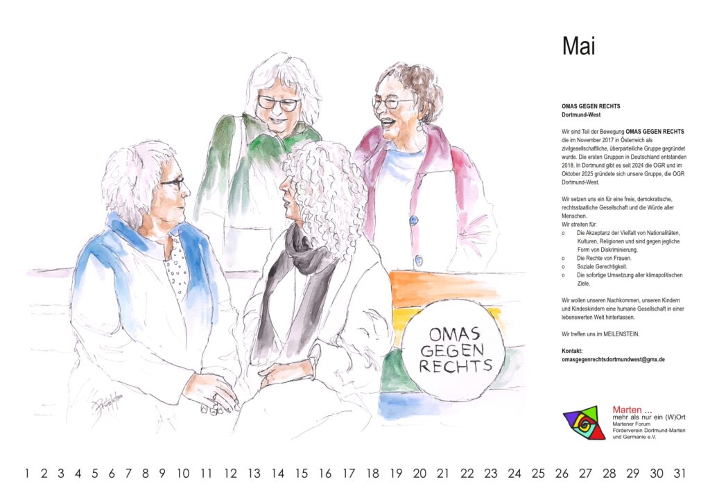 Ende des letzten Jahres teilte sich die große Dortmunder Gruppe auf in einen Ost- und einen West-Teil. Die Vorsitzende des Fördervereins Dortmund-Marten und Germania e.V., Monika Rößler, freut sich ganz besonders darüber, dass die Omas gegen Rechts Dortmund-West nun auch in Marten, unserem Stadtteil der Vielfalt mit verankert sind.
