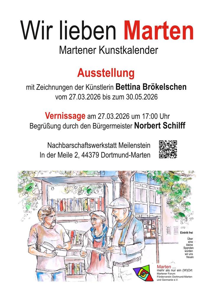 Die Künstlerin Bettina Brökelschen hat für unseren Stadtteil Kalenderblätter mit Motiven von Personen und Orten aus Marten und Germania gestaltet. Der Kalender ist ein immerwährender Kalender und kann für 10 Euro erworben werden. Bestellungen werden gerne hier entgegen genommen. Der Kalender ist im Format DINA 3 erhältlich.
